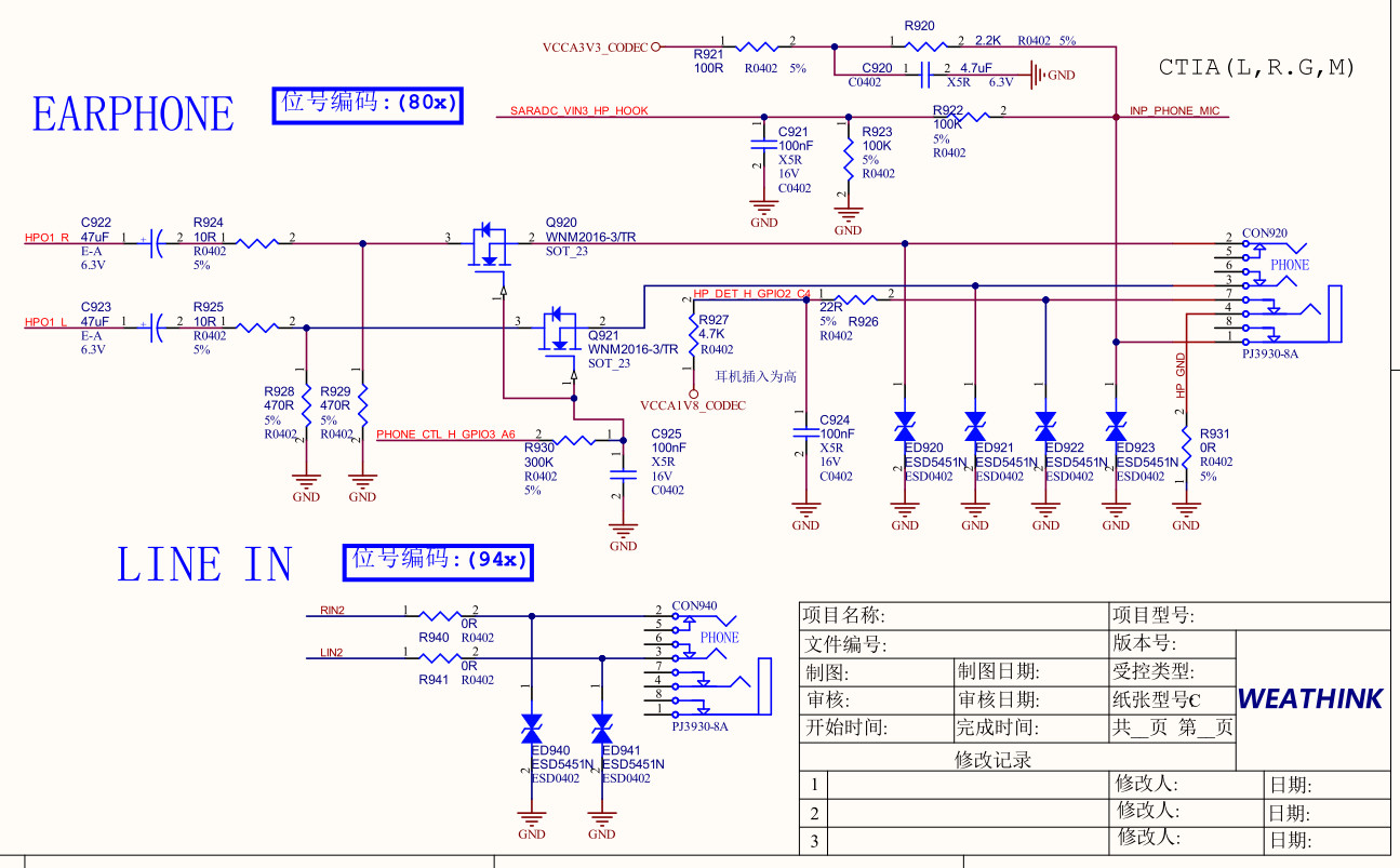参考原理图 002.jpg,耳机输出端采用了 47uF 电解电容(C922/C923)进行直流隔离。为了解决开关机瞬间的“砰砰声”问题,WEATHINK 设计了基于 MOSFET(Q920/Q921)的静音控制电路。同时,接口处部署了专用的 ESD 保护管(ED920-ED923),大幅提升了接口的抗静电可靠性。