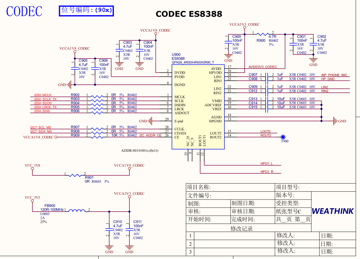 在原理图 001.jpg 中,电源设计的稳定性是音质的关键。系统通过磁珠 FB900 将模拟电源 VCCA3V3_CODEC 与数字电源进行隔离,并配合多组 4.7uF 与 100nF 的电容组合,有效滤除高频噪声,确保底噪控制在极低水平。
