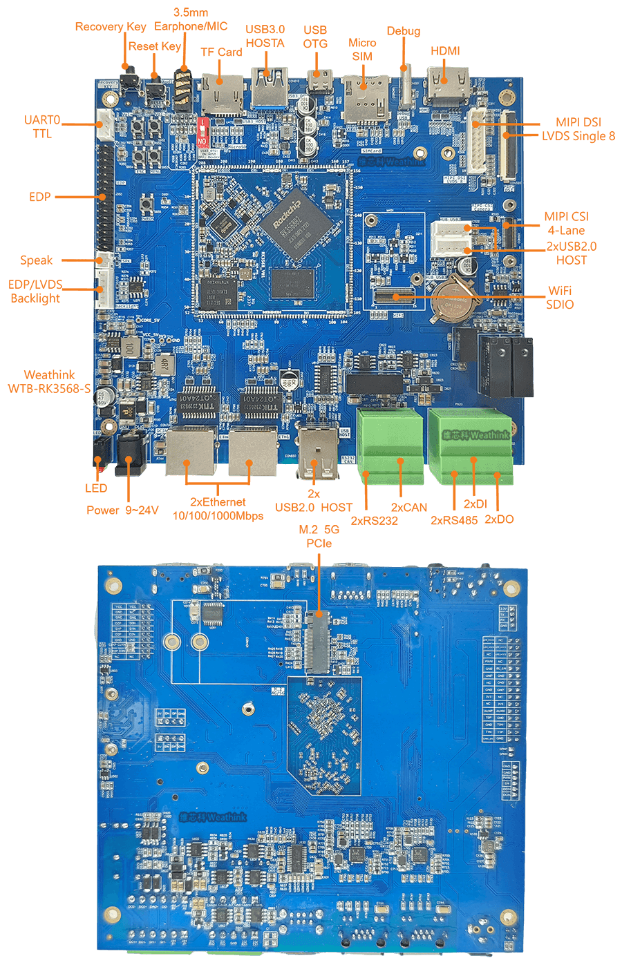 拥有丰富的扩展接口:双路千兆以太网(RJ45)、MIPI-CS1、HDMI2.1、USB3.0、USB2.0、Type-C(Debug)、凤凰端子座(RS485RS232、CAN)、M.2(扩展5G)、等接口,方便连接各类外设,实现多领域产品应用