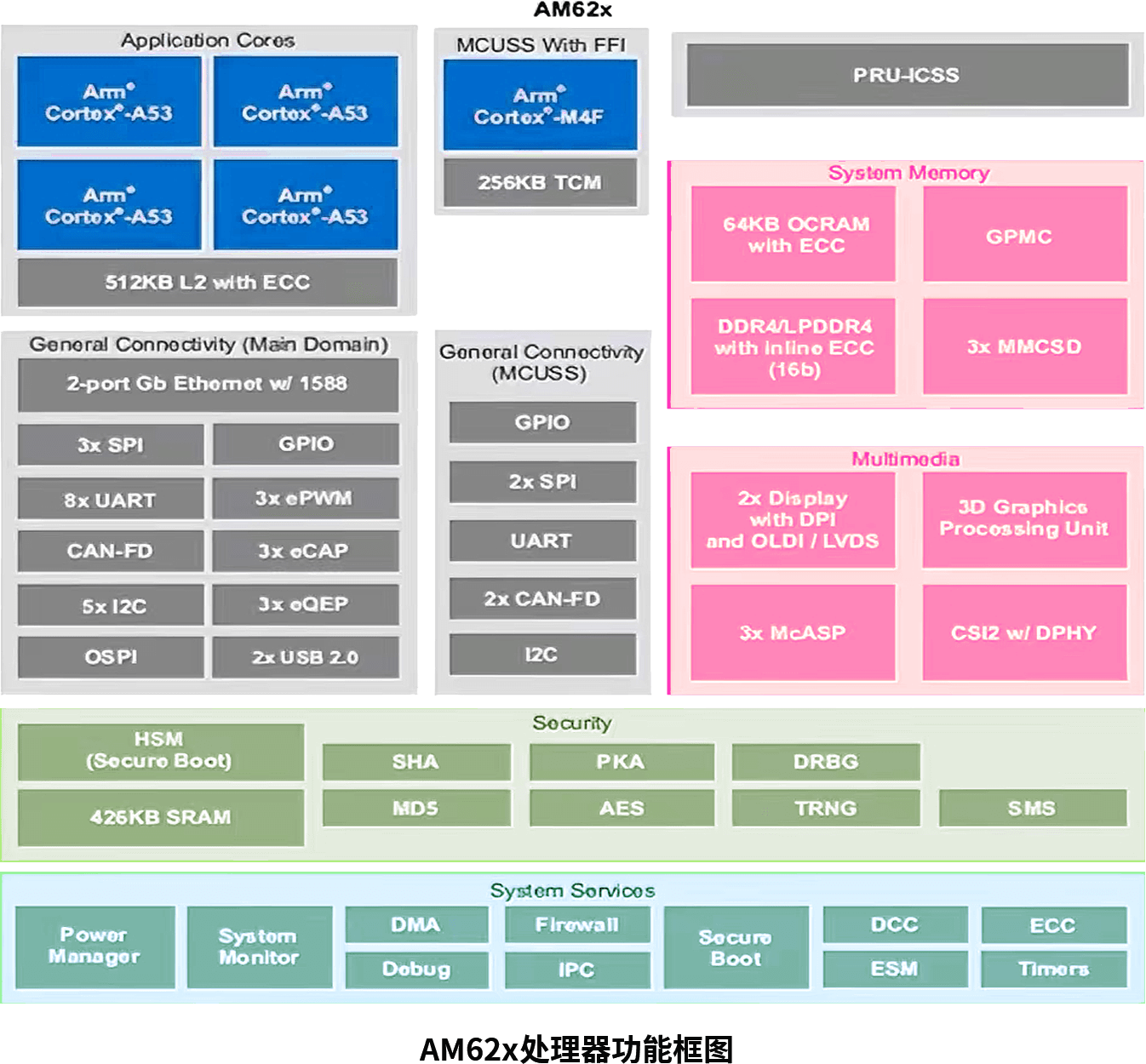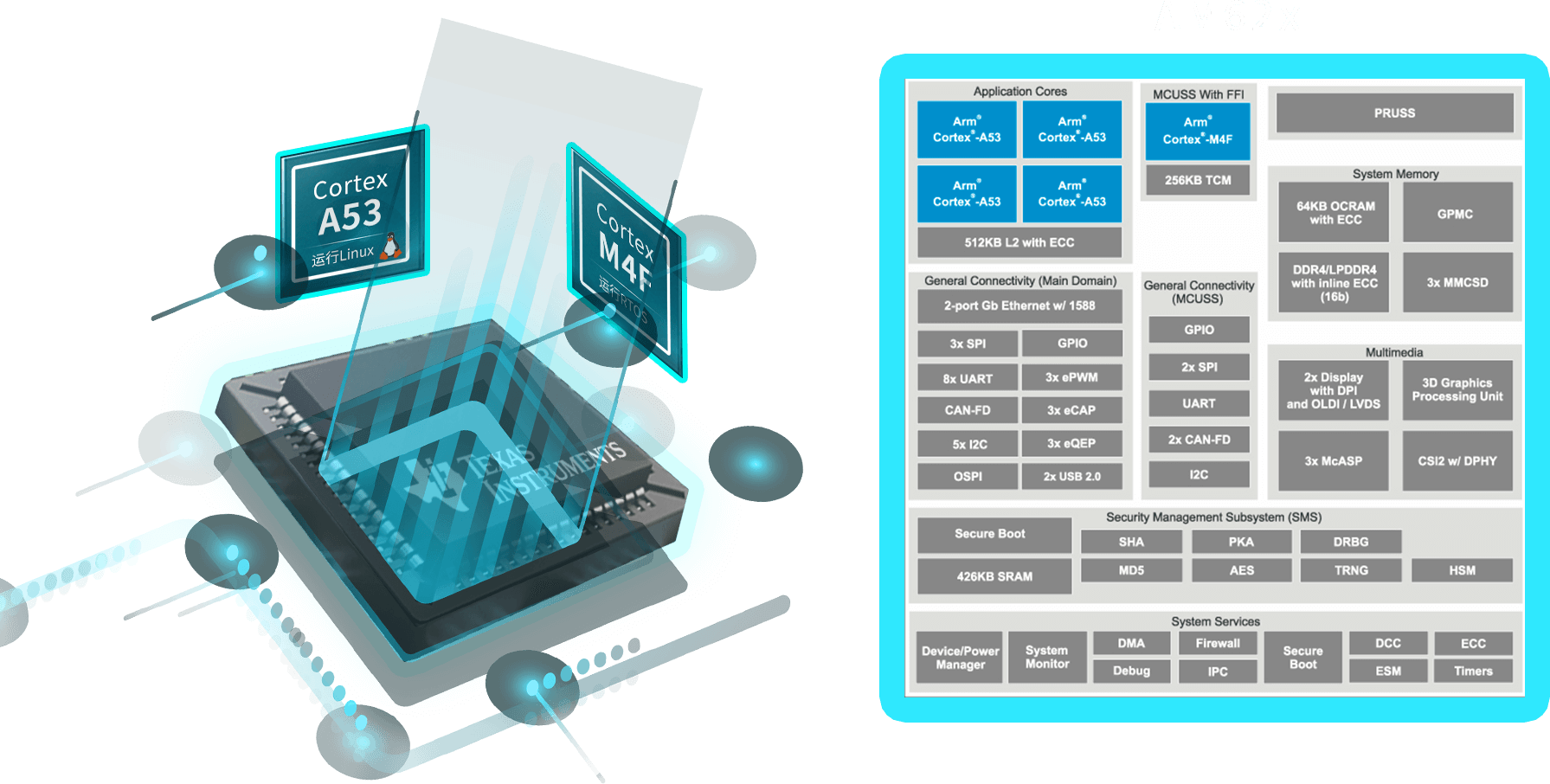 AM62x是一颗多核异构处理器,采用Cortex-A53+Cortex-M4F的处理核+控制核架构组合; 可通过M4F内核及其专用外设实现功能安全特性,并且M4F内核的启动和运行不再依赖A53内核。