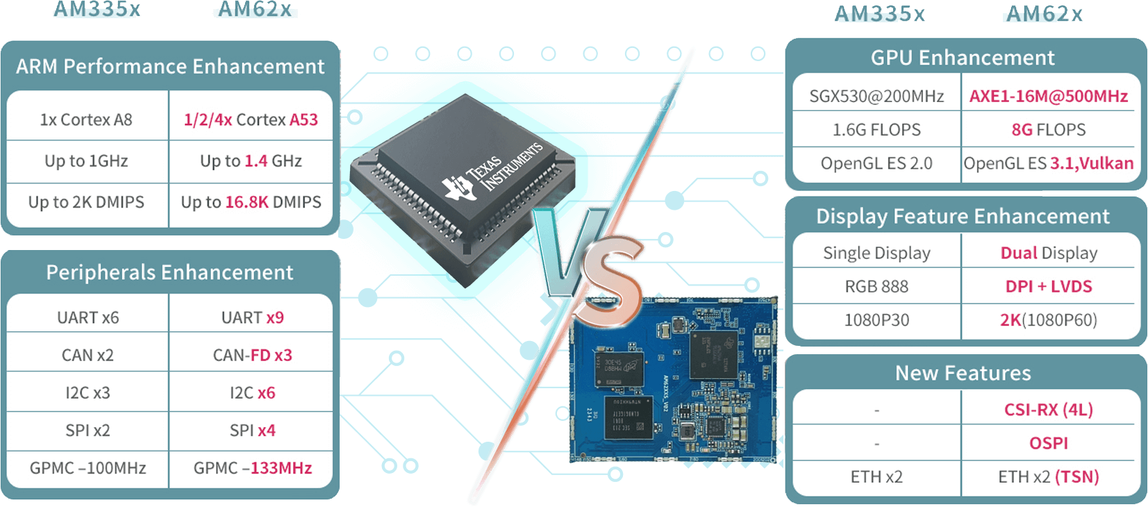 WTC-AM62XX-S核心板及开发板采用的AM62x处理器作为TI Sitara™产品线新一代MPU产品,相比上一代经典处理器AM335X具备更高性能及功能扩展性,将接替AM335X续写下一个十年!