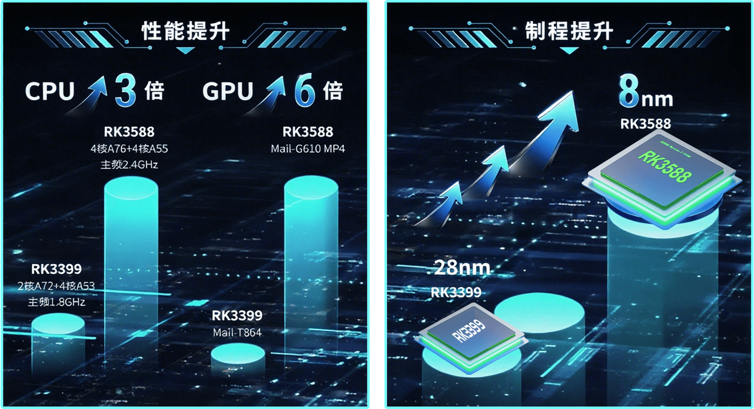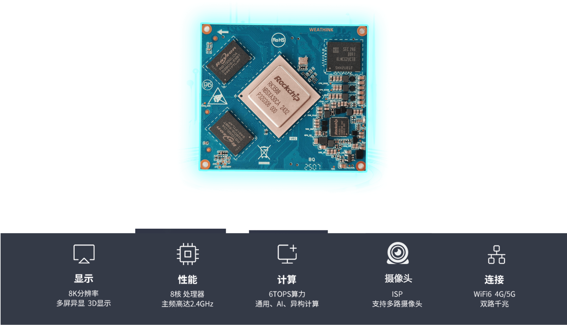 作为瑞芯微8K时代的首款通用型SoC,RK3588在整数运算、浮点运算、内存、整体性能、功耗及核心面积等方面都进行了重大改进,先进的8nm制程工艺;集成ARM Mali-G610 MP4 以及单独的NEON协处理器,提供强大性能支撑。