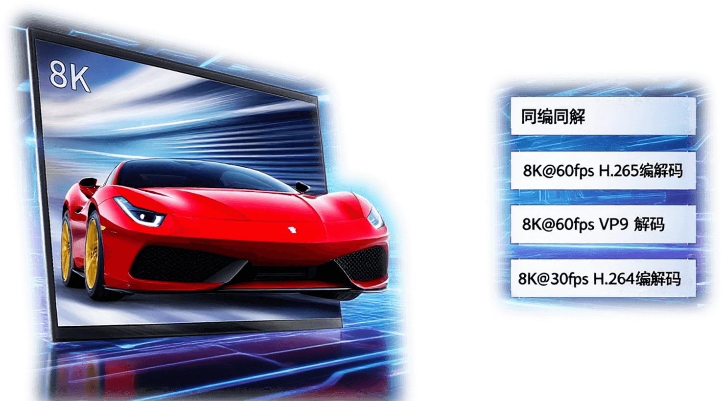 RK3588支持8K显示输出,并采用瑞芯微第四代编解码技术,支持解码器8K@60fps VP9、4K@60fpsAV1、8K@60fps H.265、8K@30fps的H.264;支持编码器8K@30fps H.264和H.265;支持同编同解,最高可实现32路1080P@30fps解码和16路1080P@30fps编码;强大的视频编解码能力可让画面8K高清呈现,画质更细腻。