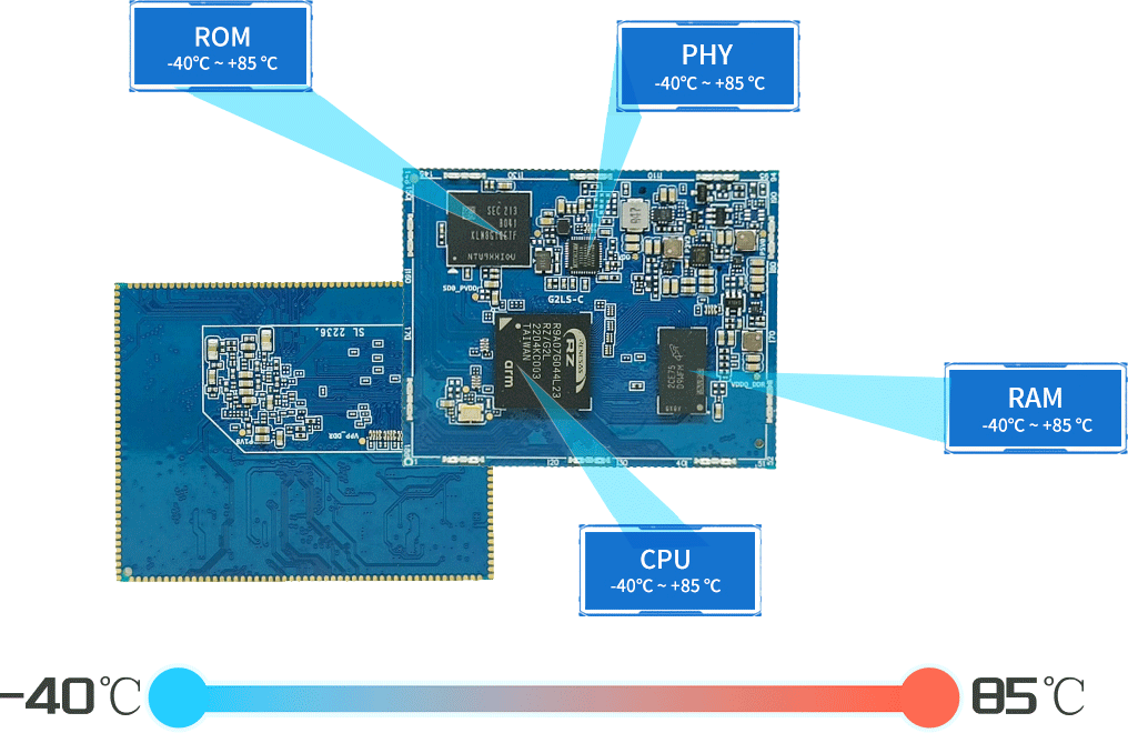 核心板全部器件采用工业宽温-40~85℃设计,内置看门狗、ESD静电防护,严格按照工业标准测试和生产,保障在户外严苛环境下7×24小时不间断稳定运行,满足工业应用的高质量和可靠性要求。