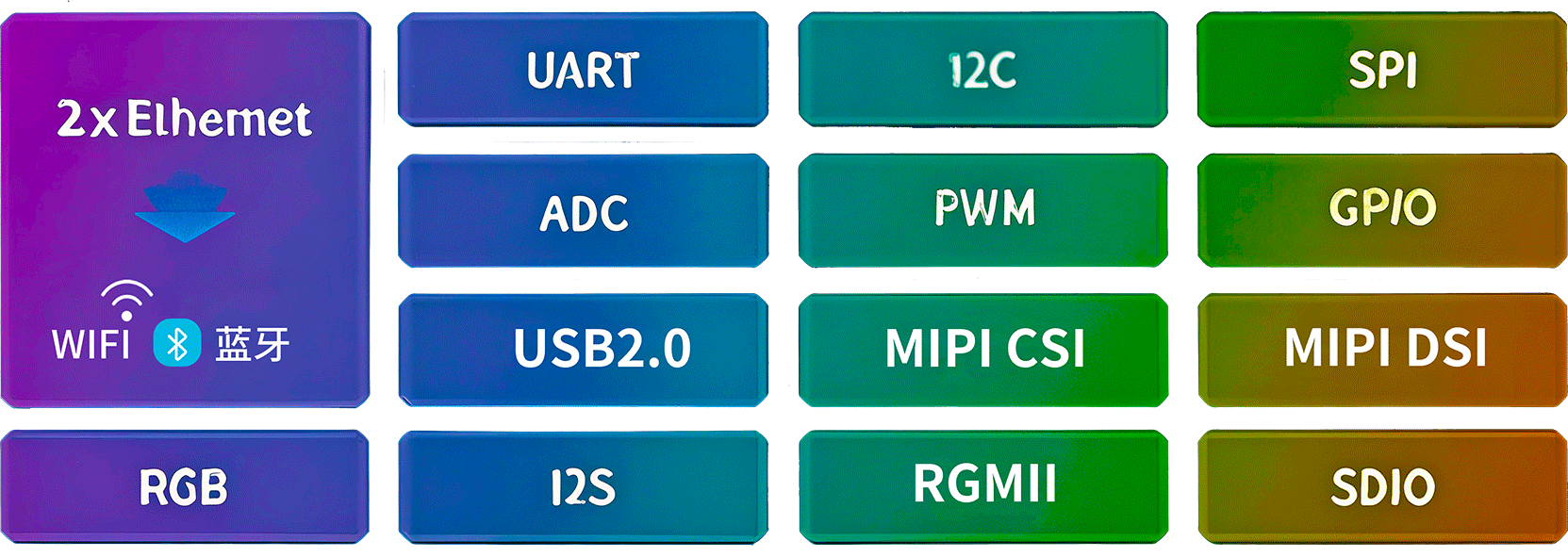 丰富的外设接口资源,让WTC-G2LS核心板具有强大的易用性和泛用性;其具备2路千兆以太网控制器、2路CAN-FD、2路USB 2.0、7路UART、 MIPI-DSI、Parallel RGB、MIPI-CSI、DVP、SD、IIS、IIC、SPI、QSPI、PWM、ADC等常用功能接口。